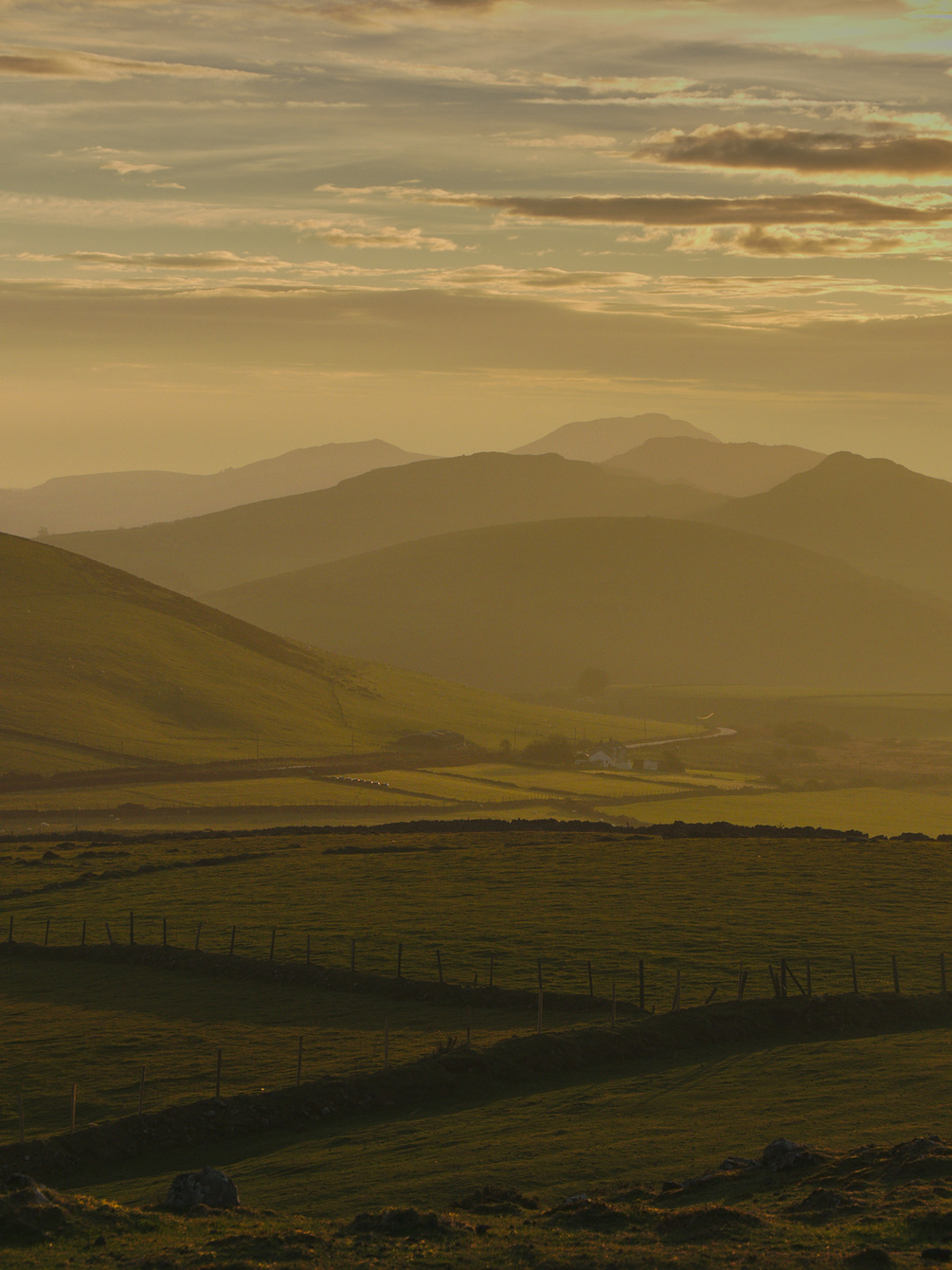 Silhouettes of the Llyn Peninsula as the sun sets over the peaks of Nefyn, Boduan and Garn Fadryn.