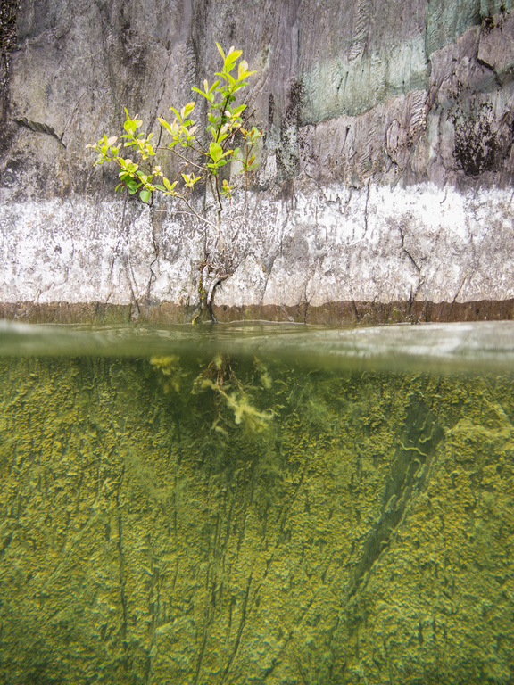 An over under shot taken whilst freediving in Dorothea Quarry, in North Wales. It is an abandoned old slate quarry in the heart of Snowdonia and reaches depths of over 100m deep.